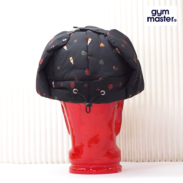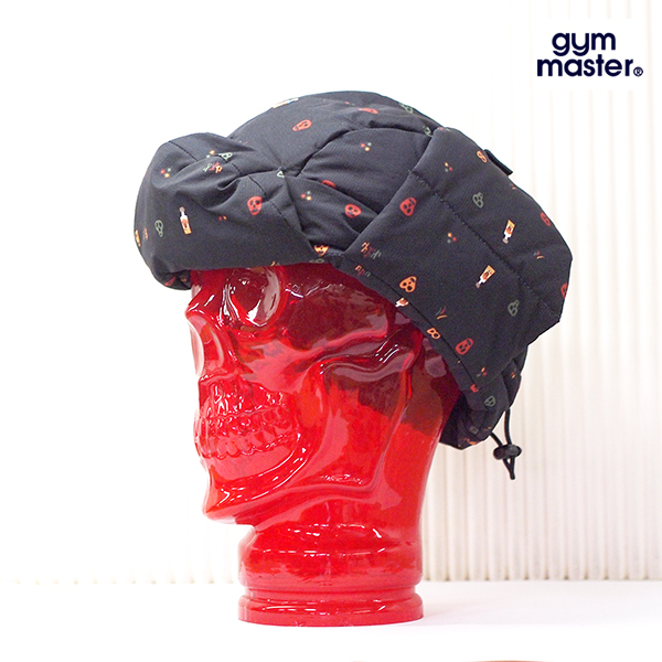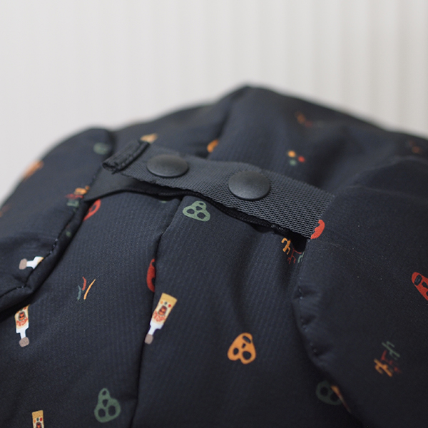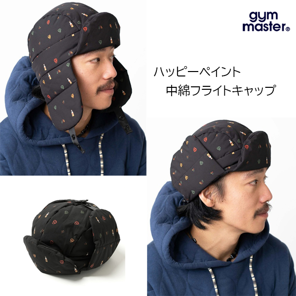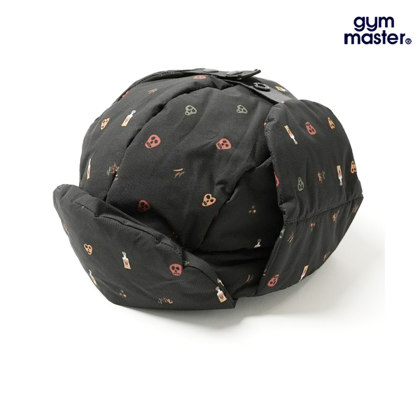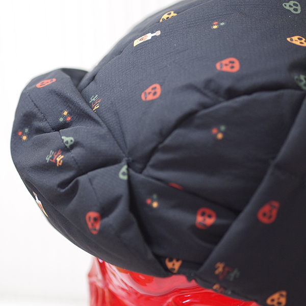 総柄のリップ生地、マットな光沢でさらさらとした生地感の 中綿フライトキャップ ホックを外すことで耳当てになり、ホックを上部で止めればベレー帽風にかぶれます。