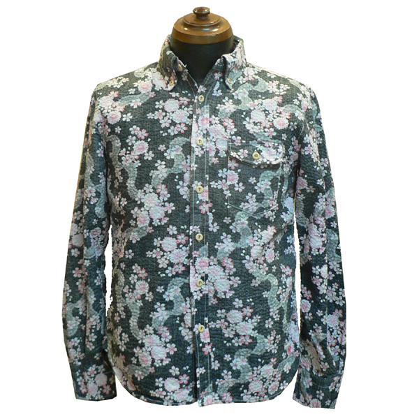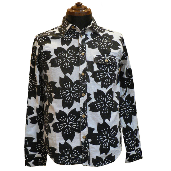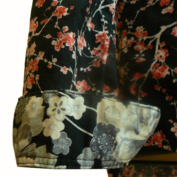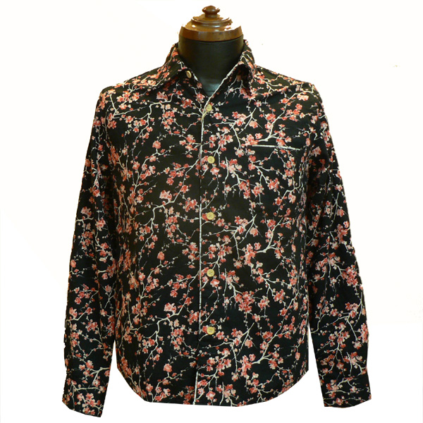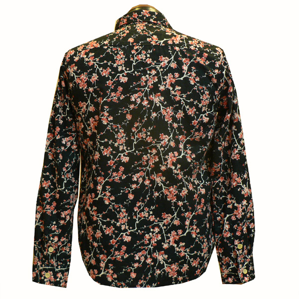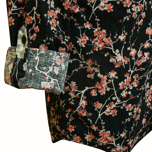 桜総柄のシャツ。袖口や前開き部分の裏側には和柄生地を配し、ちょっとしたアクセントになります。袖は、ロールアップできて便利です。