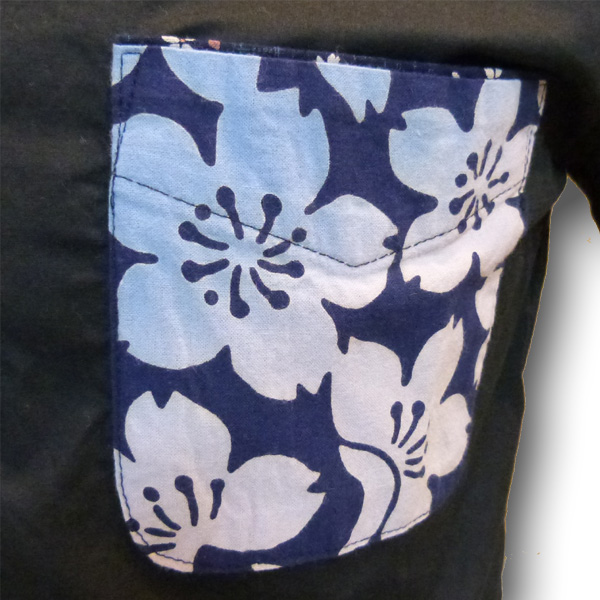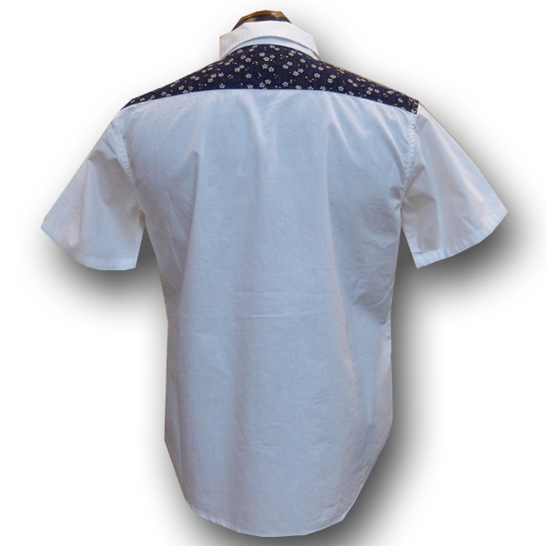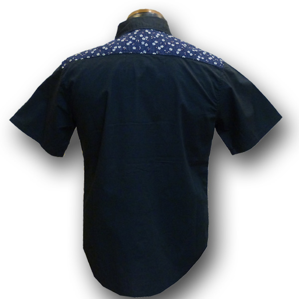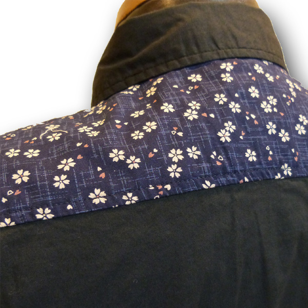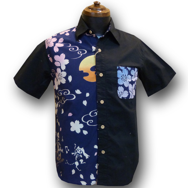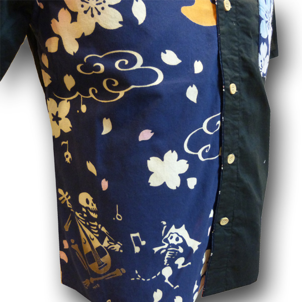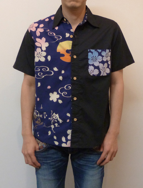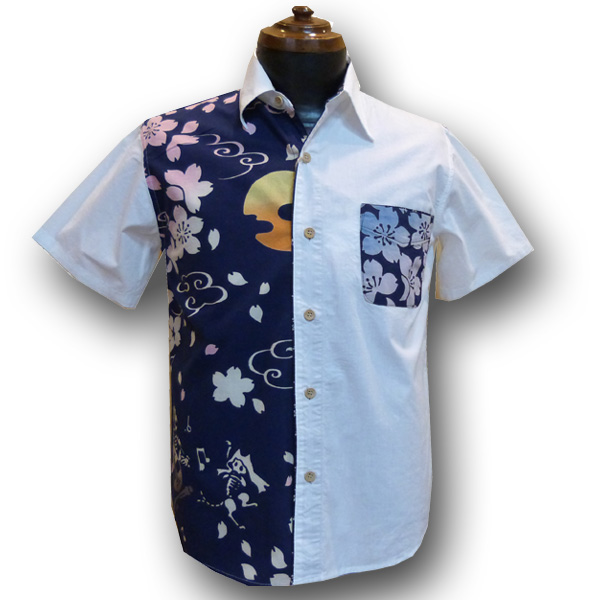 手拭いを使った半袖シャツ。桜ドクロ柄で、個性的な印象です。手拭いの素材の良さも、暑い日にはぴったり。さらりとデニムと好相性です。