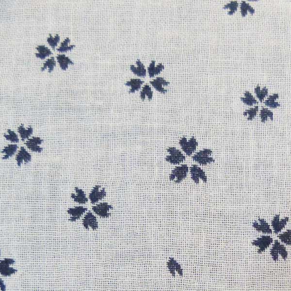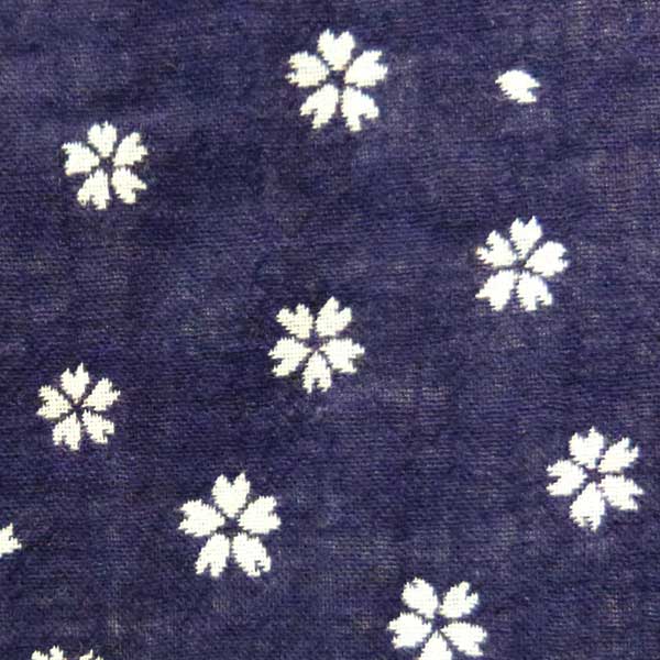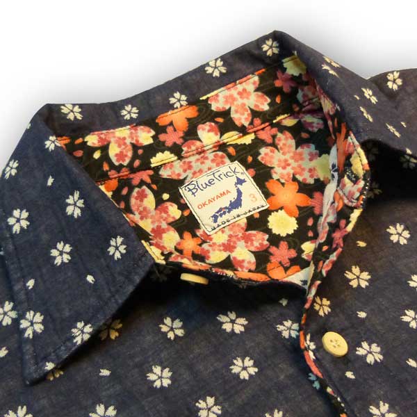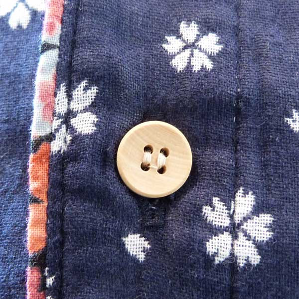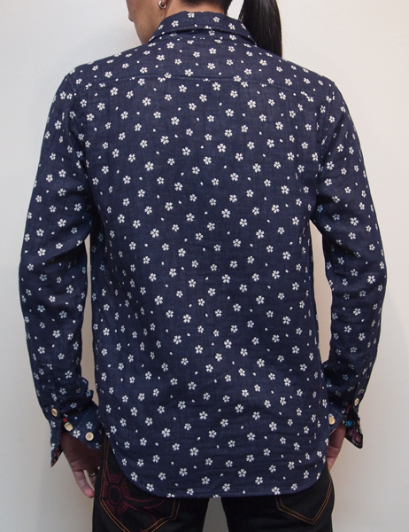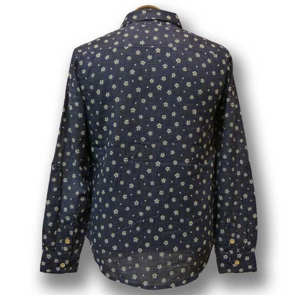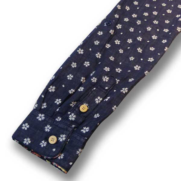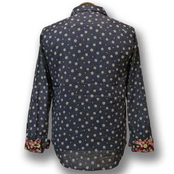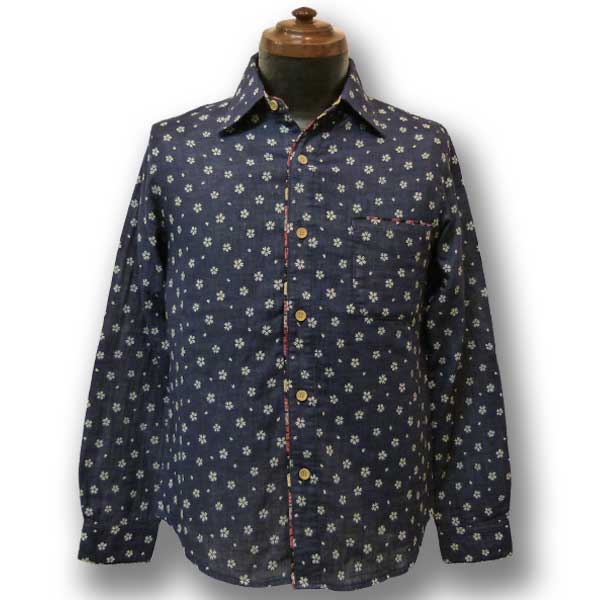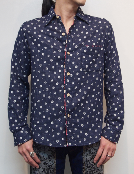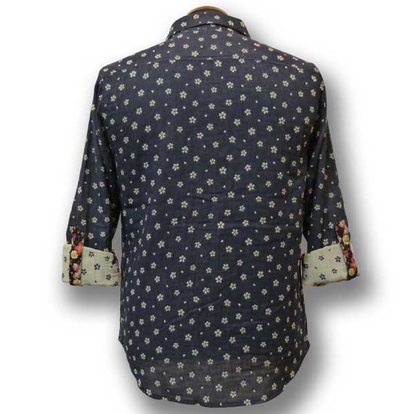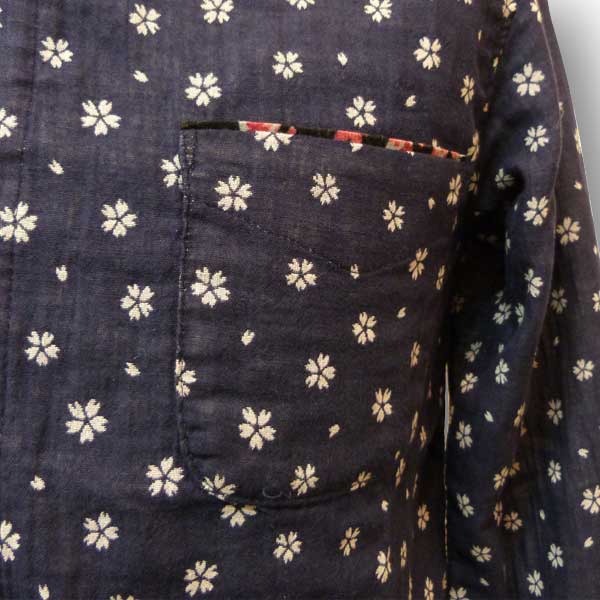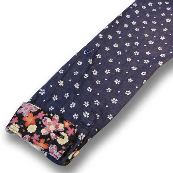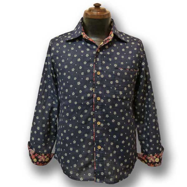 ネイビー色のWガーゼ生地に桜が散りばめられたデザインのシャツ。