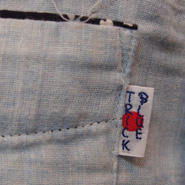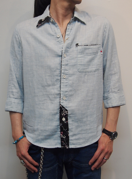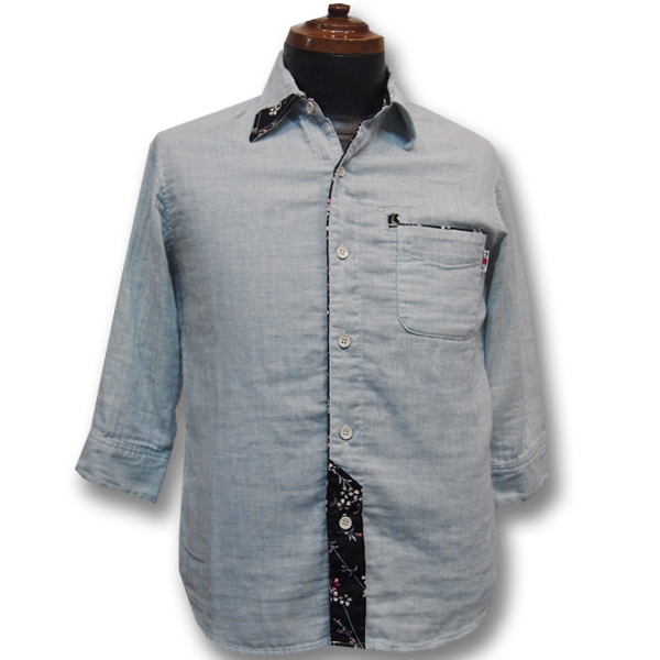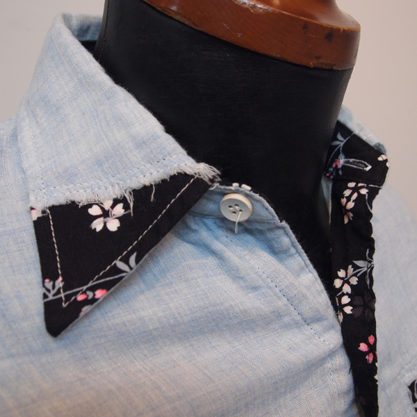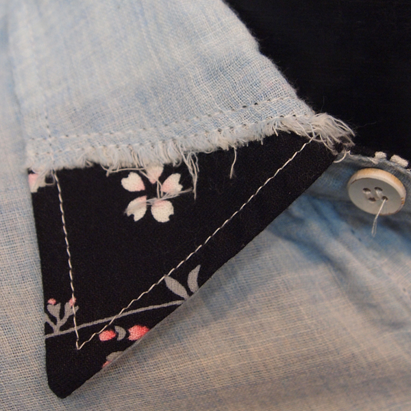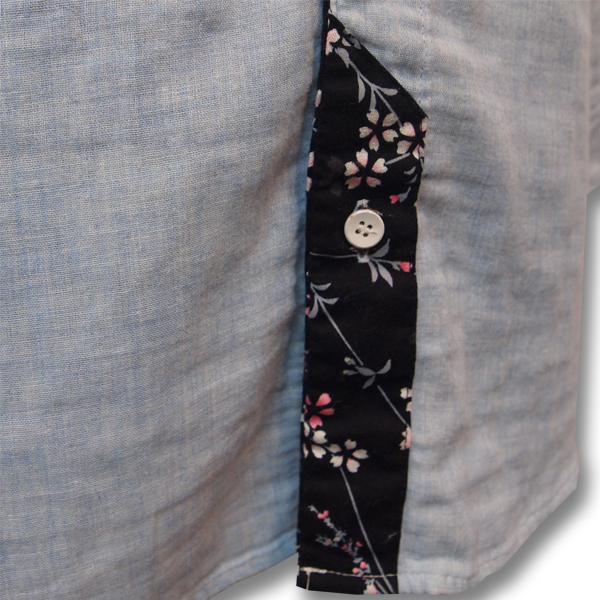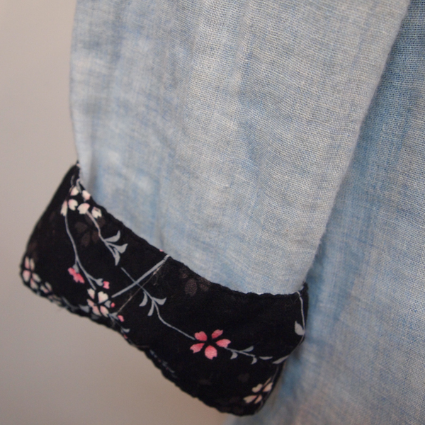 前立て裏側には柄生地を合わせ、袖口裏や、ヨーク部分のパイピングなど、同じ生地で切り替えしアクセントにしています。