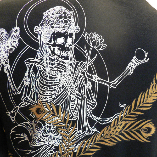 孔雀とスカルの明王を合わせたデザイン。ブラックボディにホワイトの孔雀とゴールドの明王、梵字風文字が印象的です。