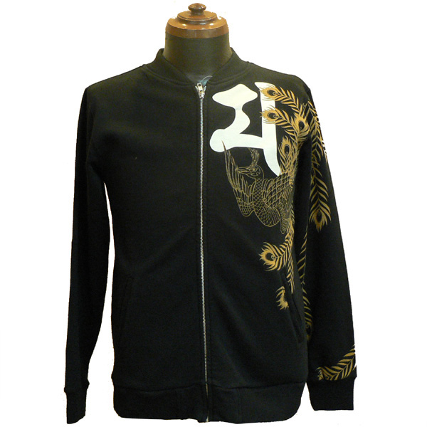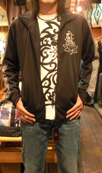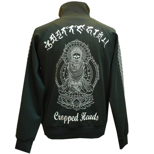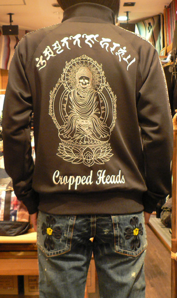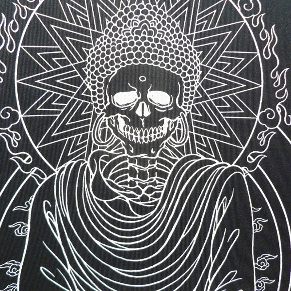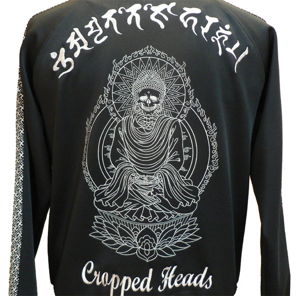 バックにはドクロの顔の阿弥陀如来がプリントされ、梵字風の文字やブランドネームが刺繍されています。