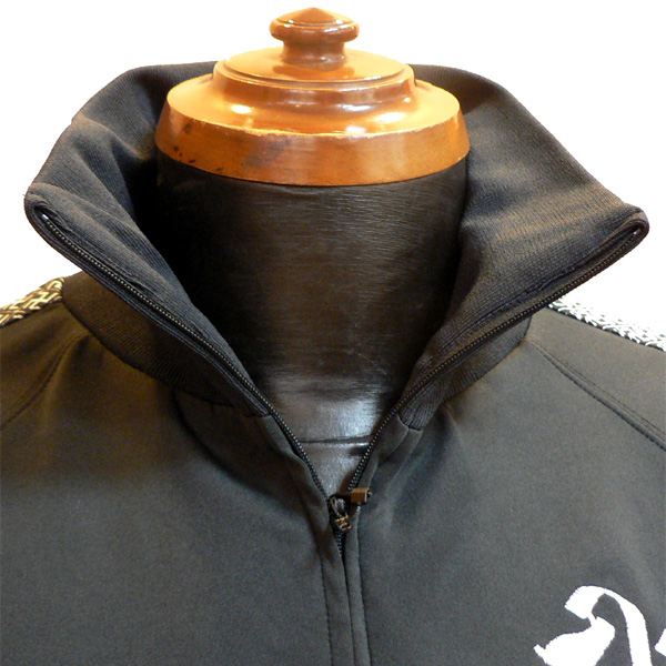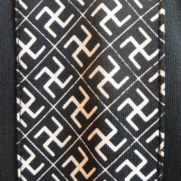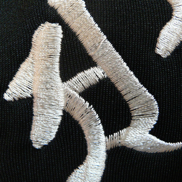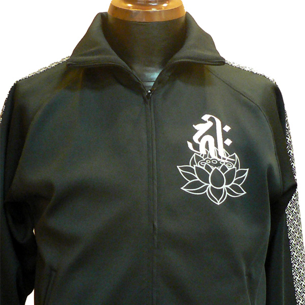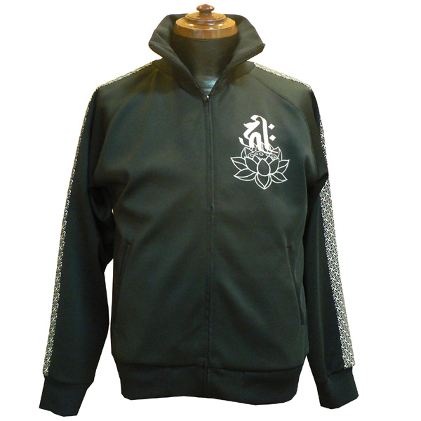 袖には卍紋の生地で肩からラインをいれました。左胸にもワンポイントの刺繍とプリント。
