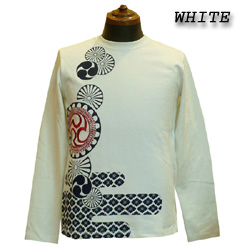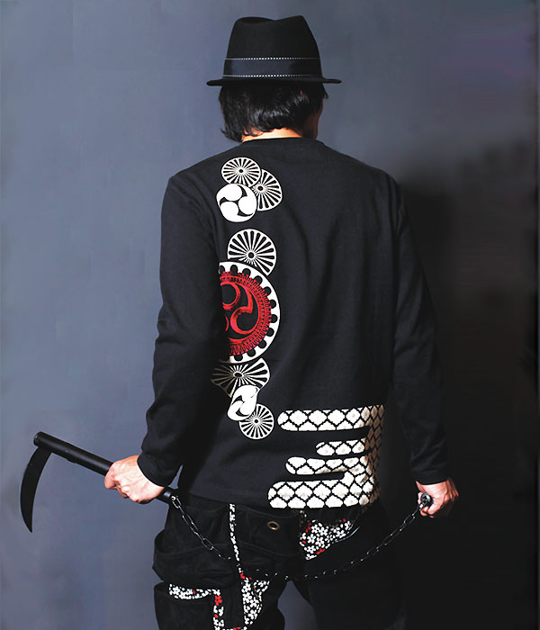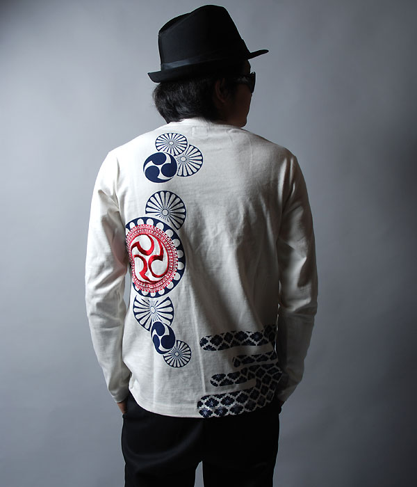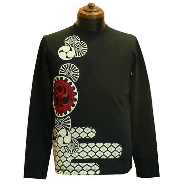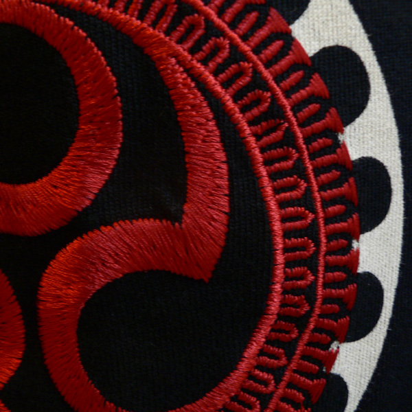 三つ巴のプリントがバランスよく配置されています。赤い部分は刺繍。