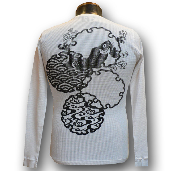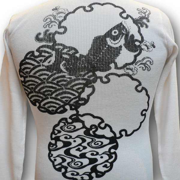 大人気のサーマル生地のボディを使用。後には波に乗った鯉がお目見え。季節感のある雪の輪で仕上げました。