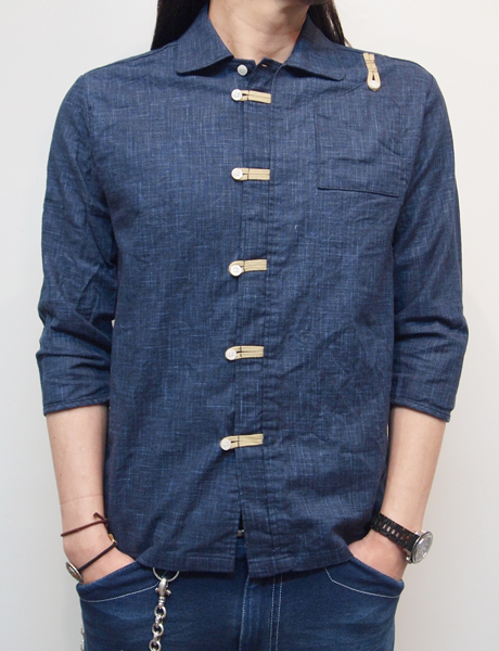 7分袖のチャイナシャツ。ボタンの留め方など、チャイナシャツをデザインした一着です。