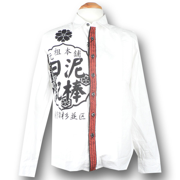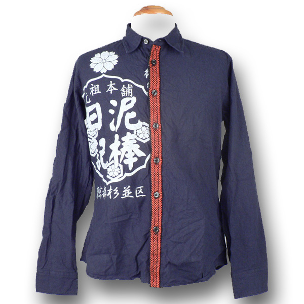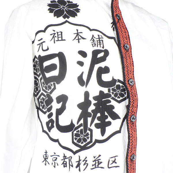 泥棒日記好きの方にはたまらないデザイン。のれん柄と前掛けテープを合わせたデザインです。軽くシワ加工されたボディも雰囲気にぴったりで味のある仕上がりに。