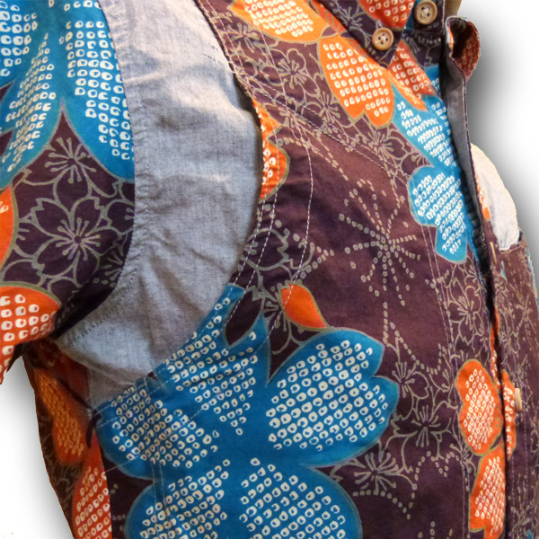 右袖の付根と左胸を無地の布で切替し、その部分は「隠しポケット」になっていて、遊び心たっぷりです。