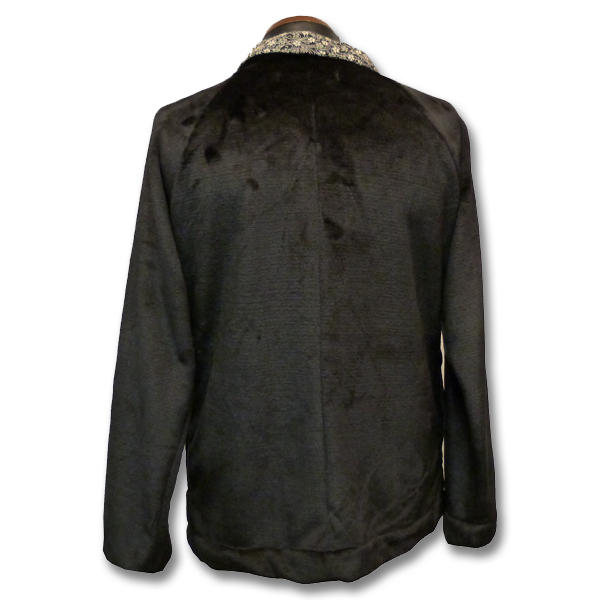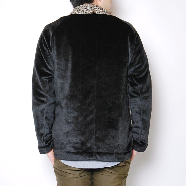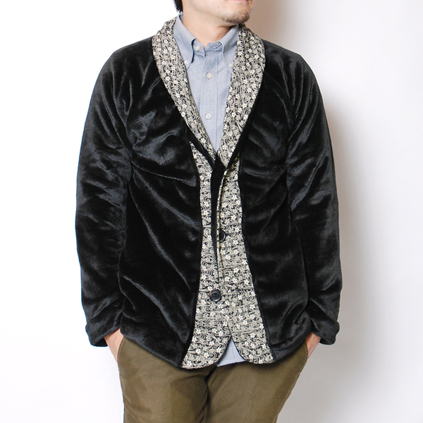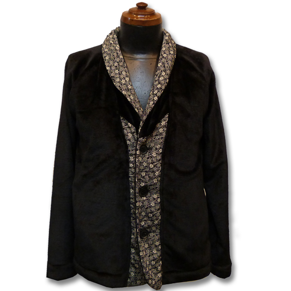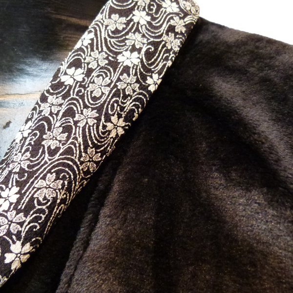 襟部分から身頃にかけて、桜流水柄生地を配し、全体のアクセントになっています。ややすっきりめのシルエットで、カーディガンとも、ガウンともとれるようなスタイルに。