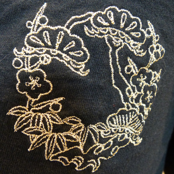 前立てに和柄生地でラインをいれ、ポイントに。胸には松竹梅の刺繍。