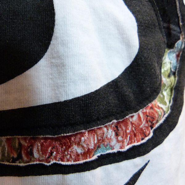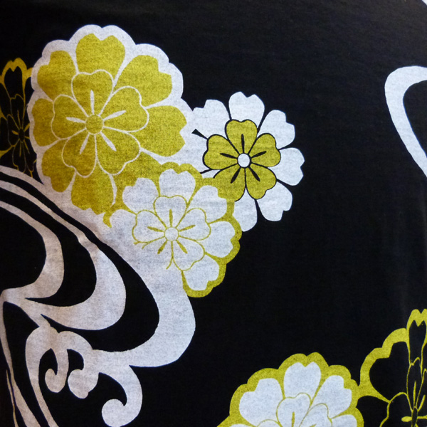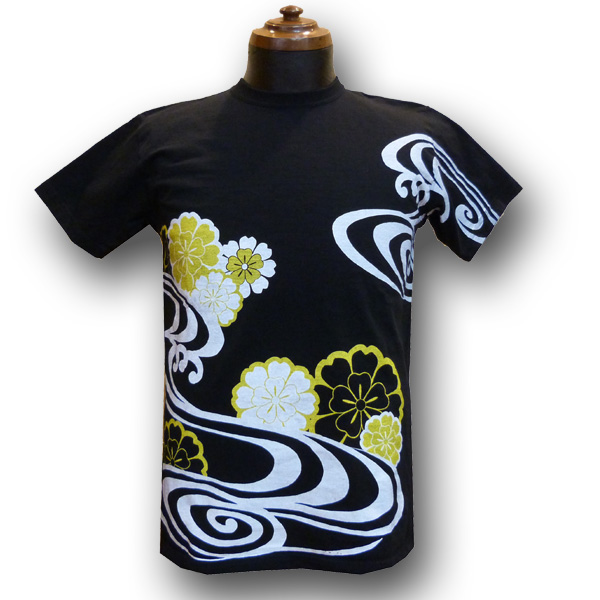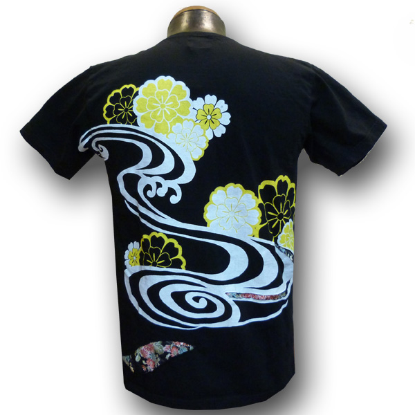 人気の桜流れデザインのTシャツ。バックには和柄縮緬生地でリメイク。ポイント人っています。