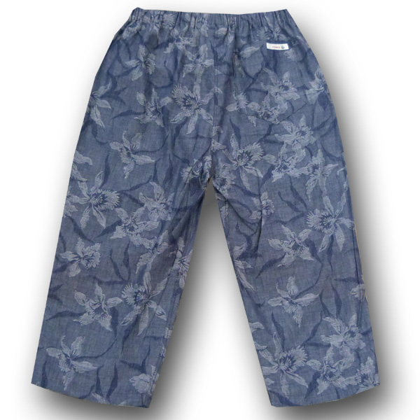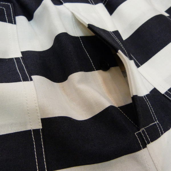 前開き、フロント、バックポケットあり。ウエストはゴム。