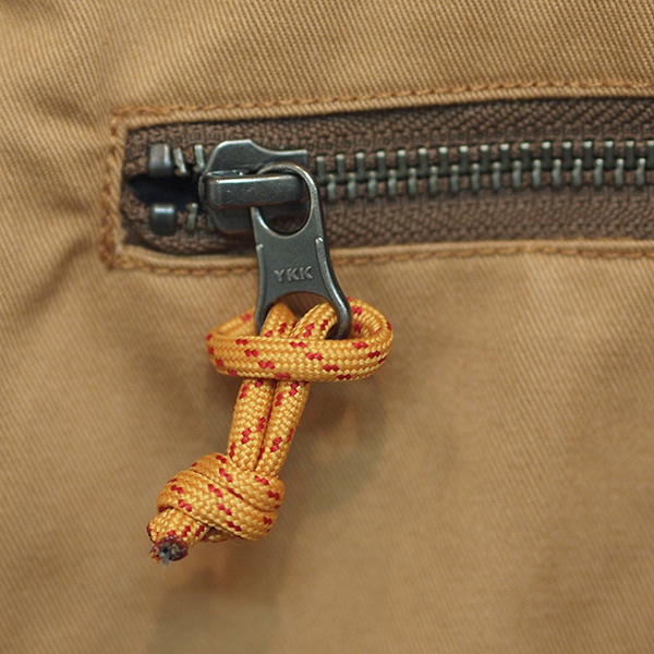ジップの引手びはnifco社のホイッスルを装備。さらにハンマーループやDカンに様々な道具を引っかけられます。