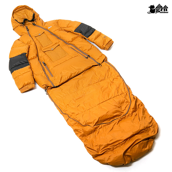 最大の特徴は 背中のジップを開くことでダウンジャケット→寝袋(シェラフ)に変身する大胆仕様。