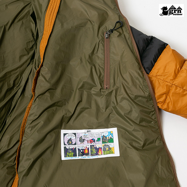 内側には某有名アウトドアブランドをパロディーしたgrn outdoorのキャラクターでもある“ダックロー”のアメコミイラストタグが施され、遊び心満載。とにかく暖かいです。