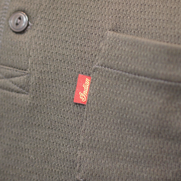 三本針の縫製、ネコ目ボタンなどのディテールも素材にマッチしたデザイン。