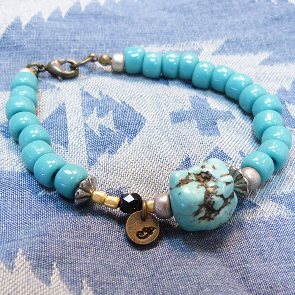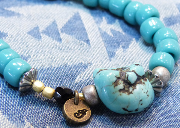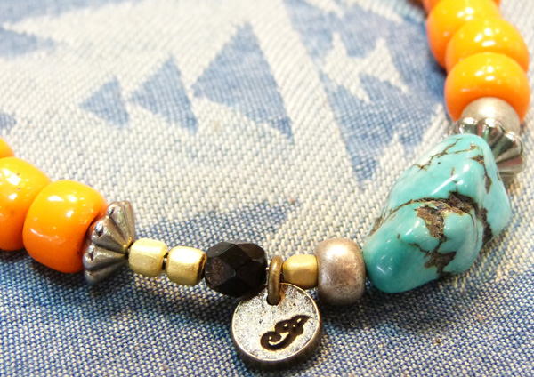 オレンジは「太陽」、ブルーは「海」をイメージした夏にピッタリなブレスレット。真鍮製のプレートにINDIANの頭文字の刻印、 型や大きさの違う小さなビーズもアクセントになっています。ビーズにターコイズをあわせたアシンメトリーなデザイン。すべてハンドメイド、made in JAPANです。