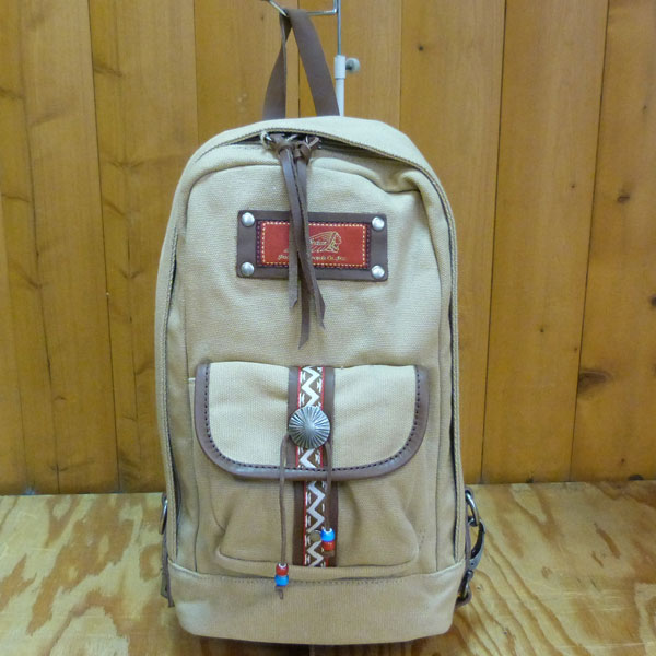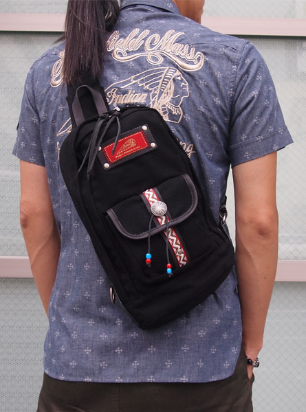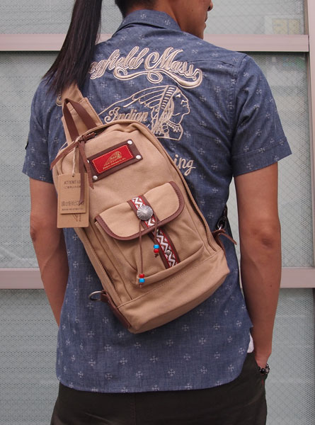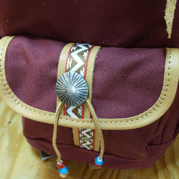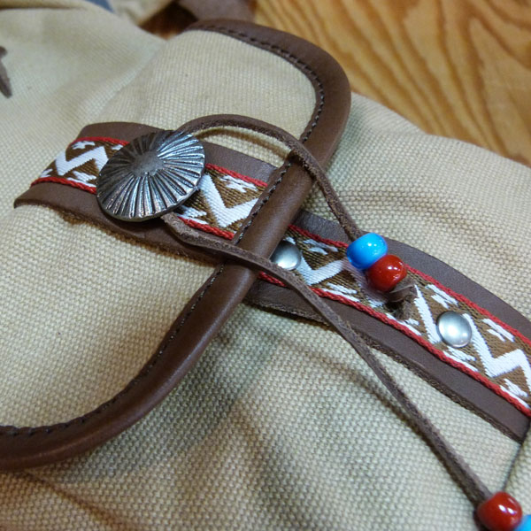 フロントポケットにはチロリアンテープやシルバーのコンチョ、ビーズなどをあしらい、INDIANテイスト溢れる鞄に仕上がっています。