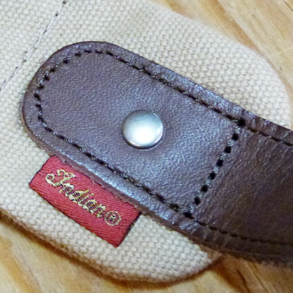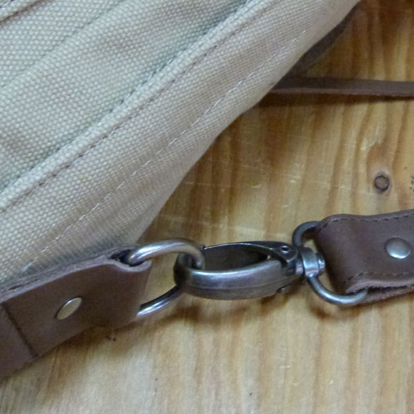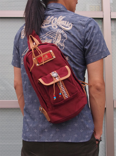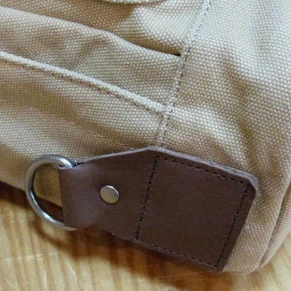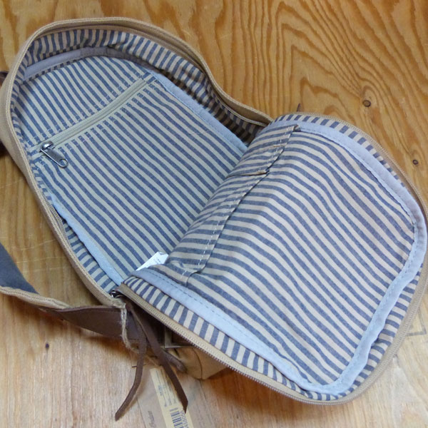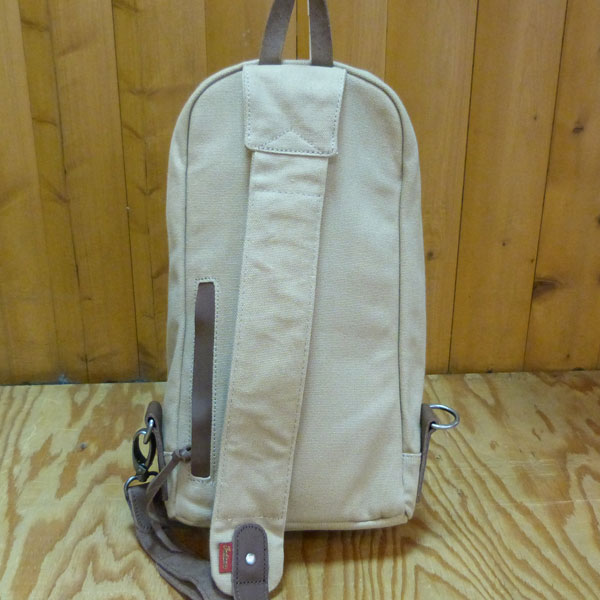 キャンバス地のボディバック。部分的にレザーを使用し、アクセントになっています。
