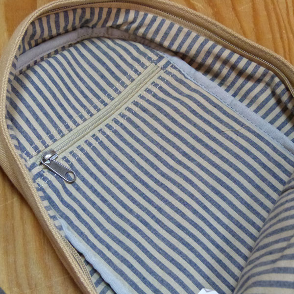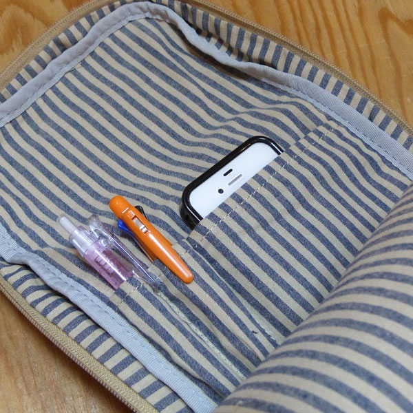 裏地はブルーのストライプ。内ポケットはファスナー付きのポケット、逆サイドにはペンホルダーが2本分と、小物用ポケットが並び、便利なつくりになっています。