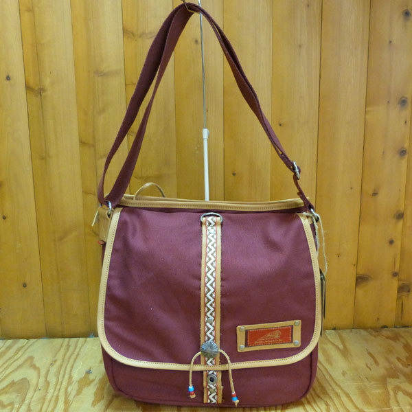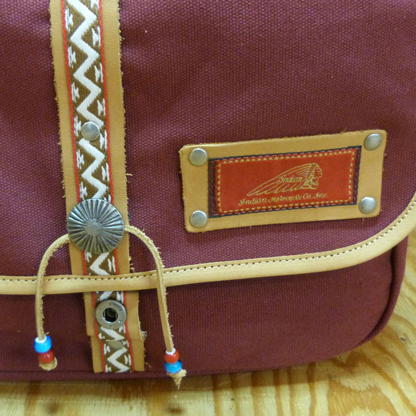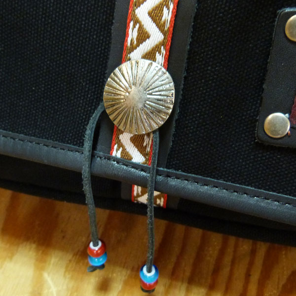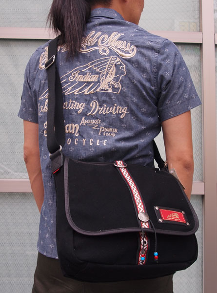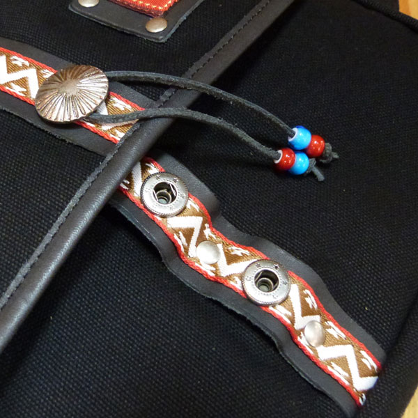 フロントにはチロリアンテープやシルバーのコンチョ、ビーズなどをあしらい、INDIANテイスト溢れる鞄に仕上がっています。