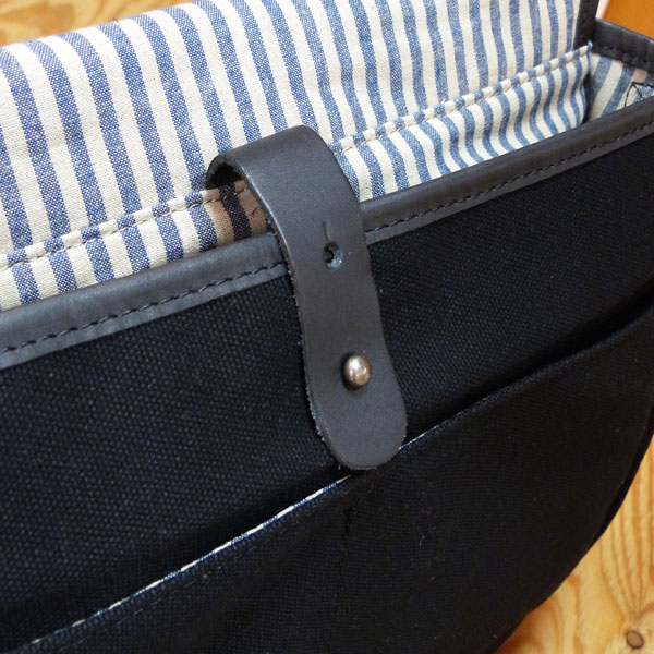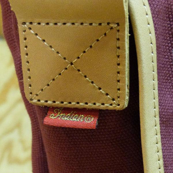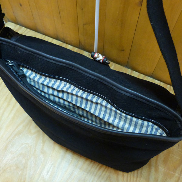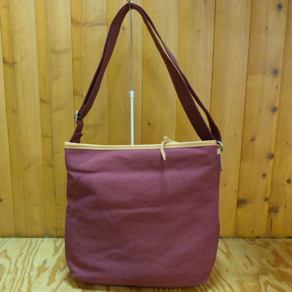 キャンバス地のショルダーバック。部分的にレザーを使用し、アクセントになっています。