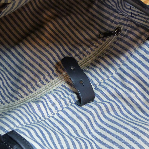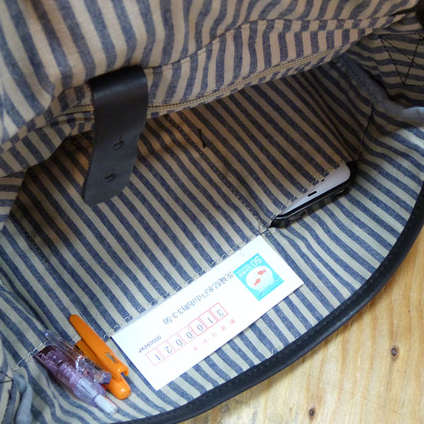 裏地はブルーのストライプ。内ポケットはファスナー付きのポケット、逆サイドにはペンホルダーが2本分と、小物用ポケット、携帯用ポケットが並んでいます。