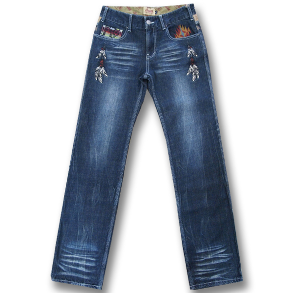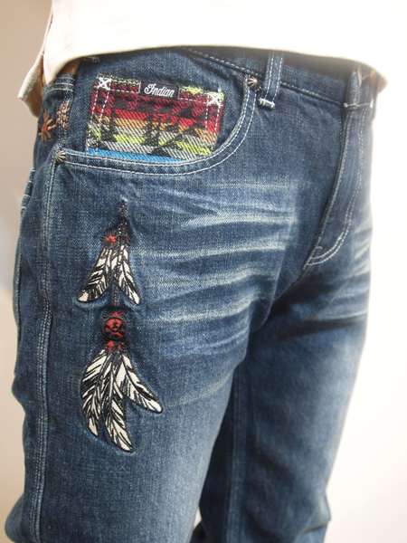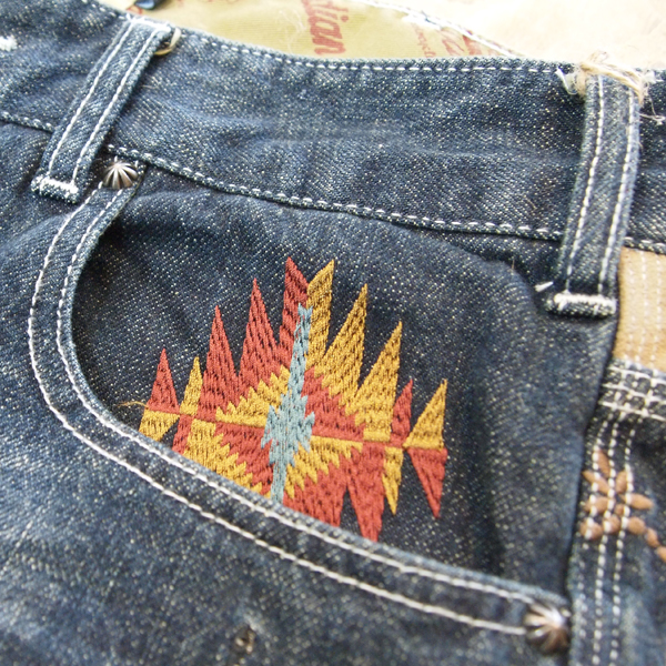 ネイティブ感あふれるデザインの一着。細部にネイティブ柄の生地を配したり、フェザーなどの刺繍をいれました。