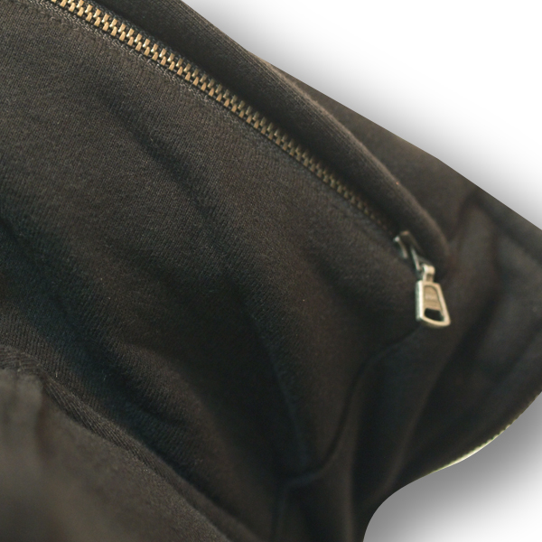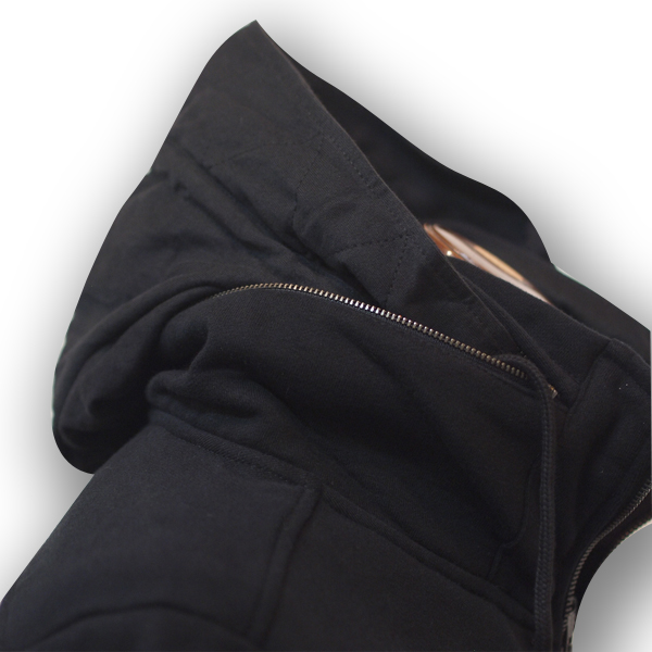 襟内にフードが隠れていて、フードのジップを開けるとフードがでてきます。