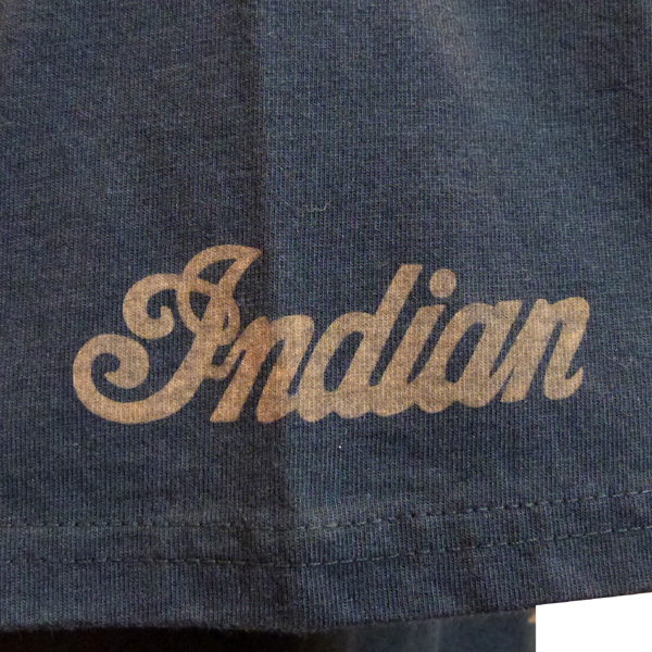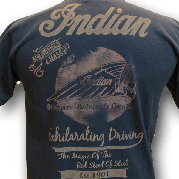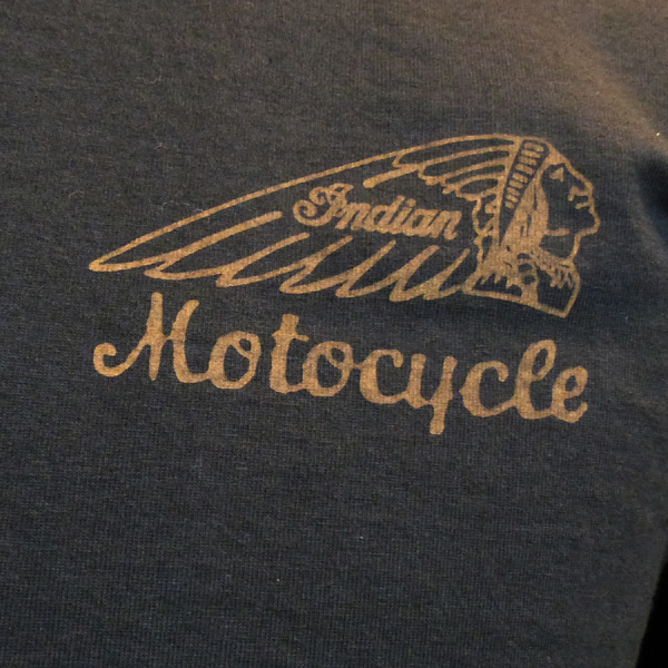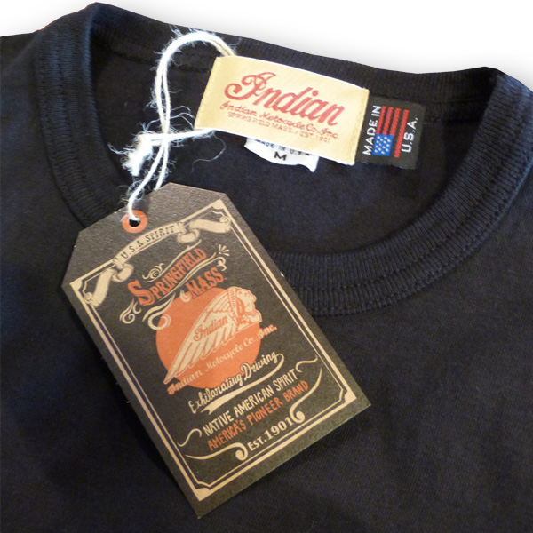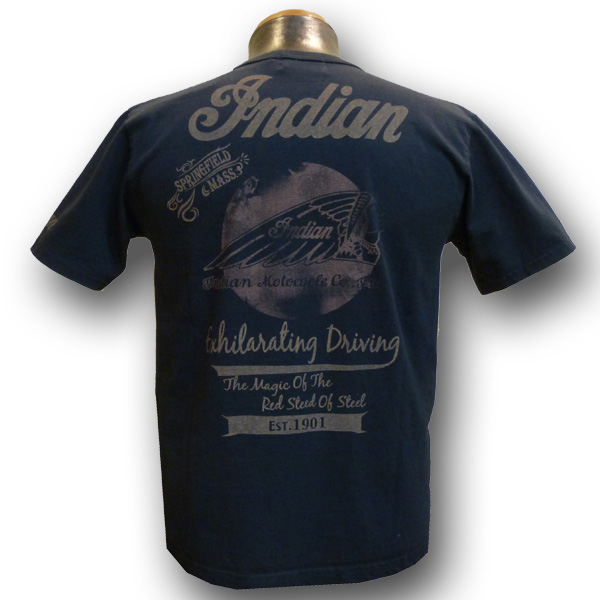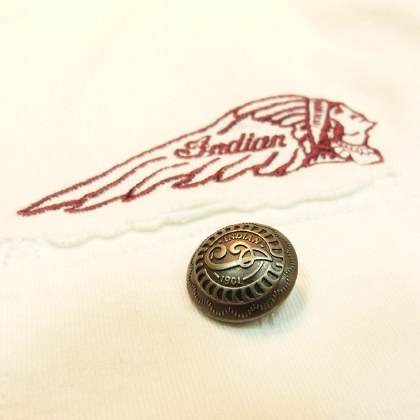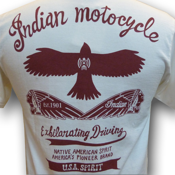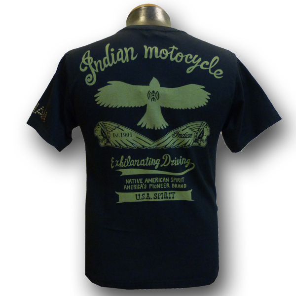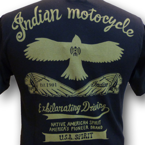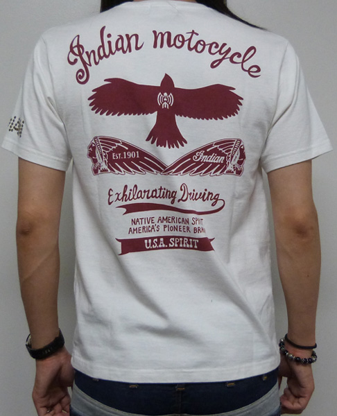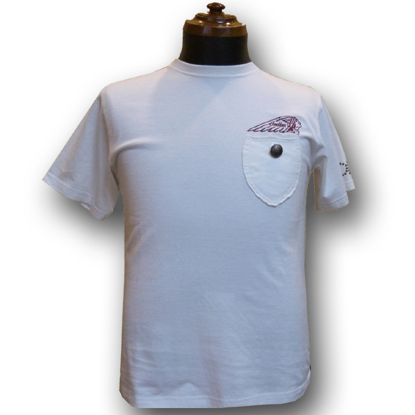 イーグル・インディアンヘッドがバックにプリントされたTシャツ。フロントはシンプルにワンポイントの刺繍がはいります。また、左胸にはポケット付き。オリジナルコンチョがアクセントになっています。左袖にはスタッズでINDIANの文字。