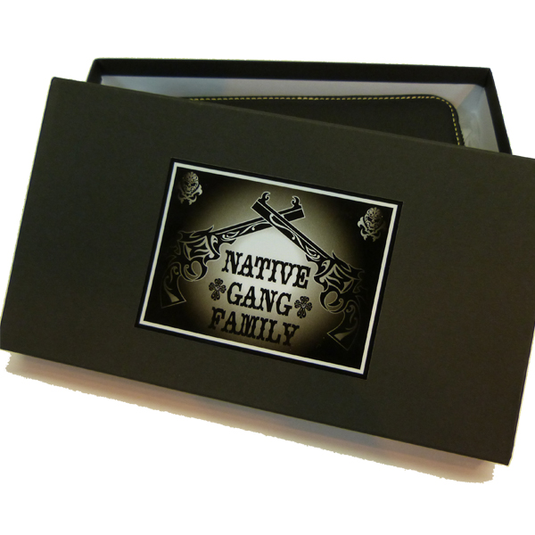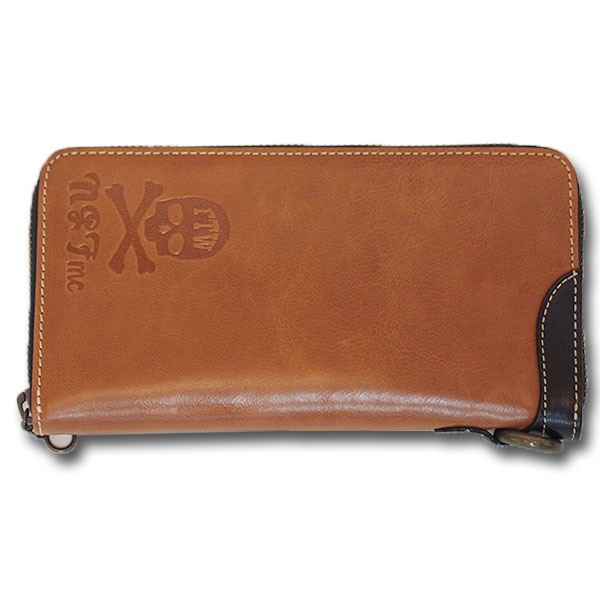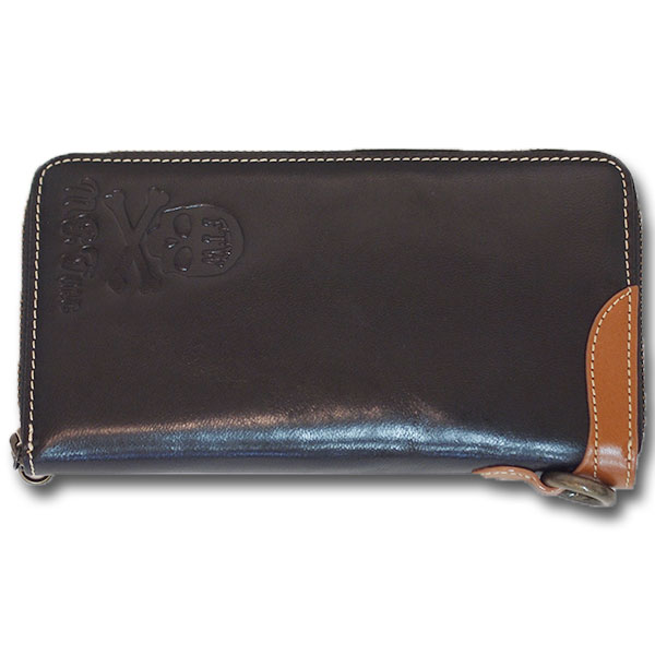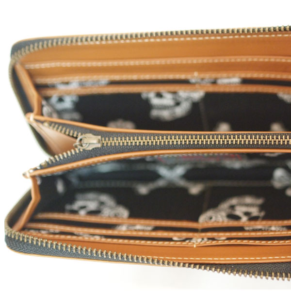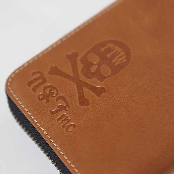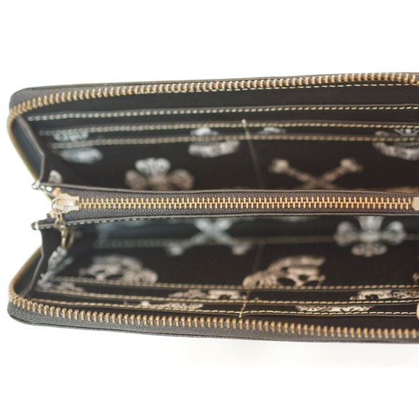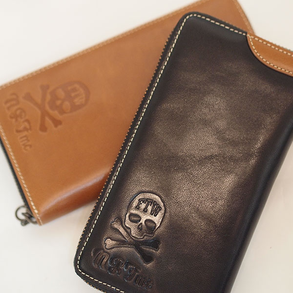 ゴート(羊)革のレザーウォレット。ラウンドファスナー型。スカルボーンの型押しをワンポイントに。
