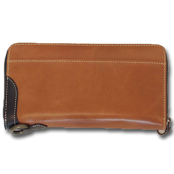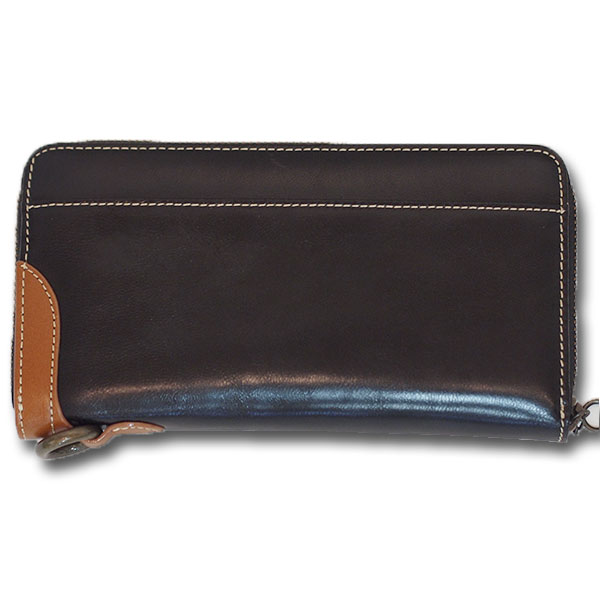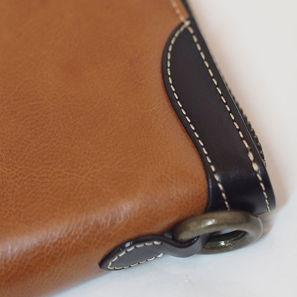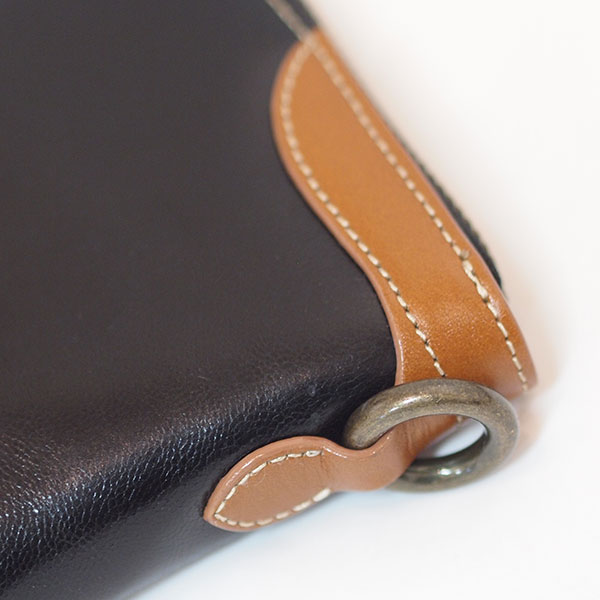 ブラックにはブラウンの、ブラウンにはブラックのレザーでアクセントをつけ、全体がぐっと引き締まります。ゴールドのリングはウォレットチェーンを付けられる仕様になっています。