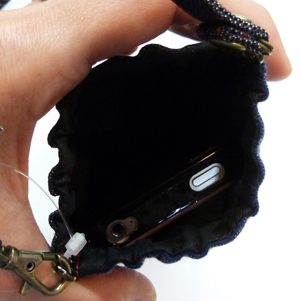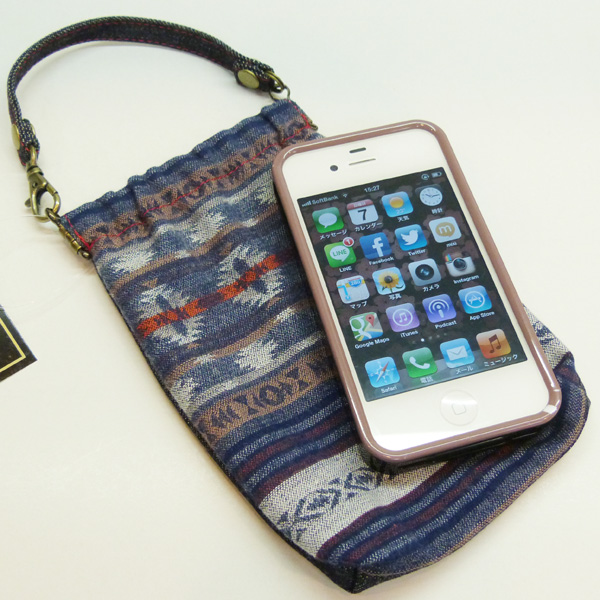 スマートフォン、携帯、タバコなどがすっぱり入るスマホバック。口部分は金具入りで、両端をつまむと開きます。また閉じるとぴたりと口が閉まるので逆さにして落ちる心配もありません。