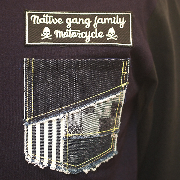 フロントの胸ポケットは4柄の生地でパッチワークに施し、