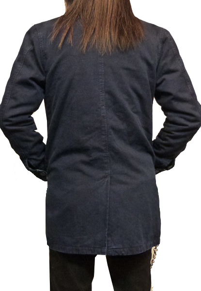シンプルなデザインと、スッキリしたシルエットのジャケットです。丈は長めで、春にはスプリングコートとして活躍します。
