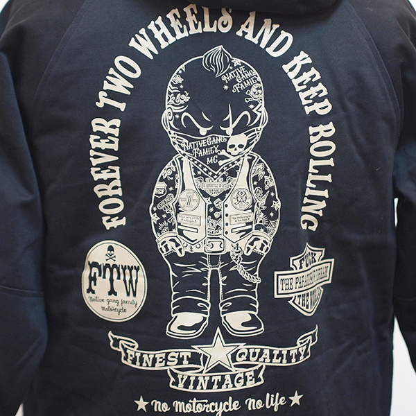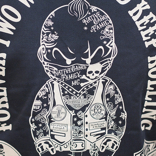 フロント胸にはNGFのワッペンを施しました。バックプリントはワイルドベイビー。タトゥーバッチリのベイビー必見です。