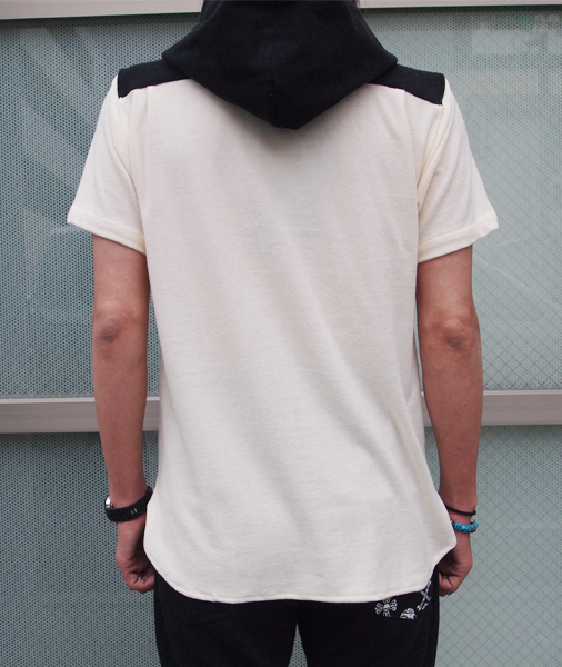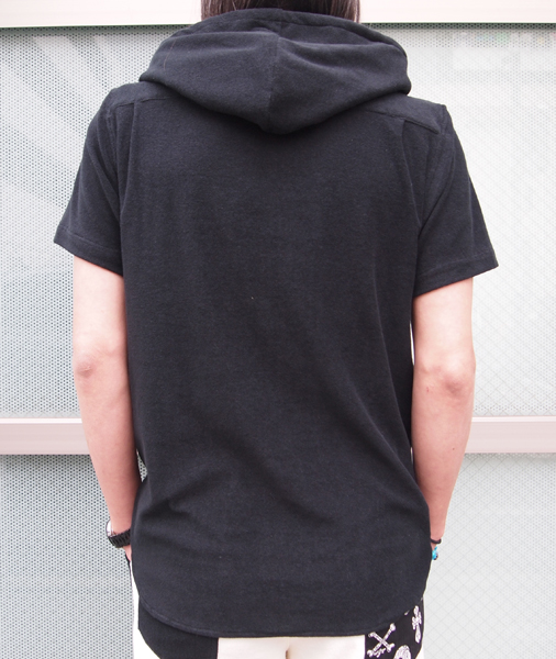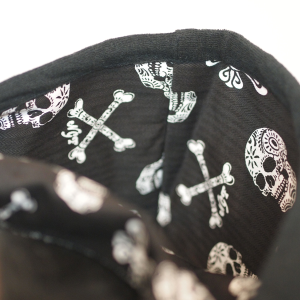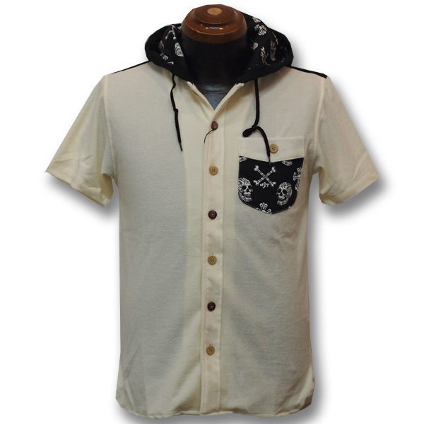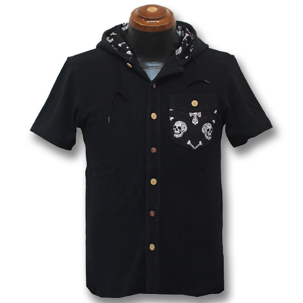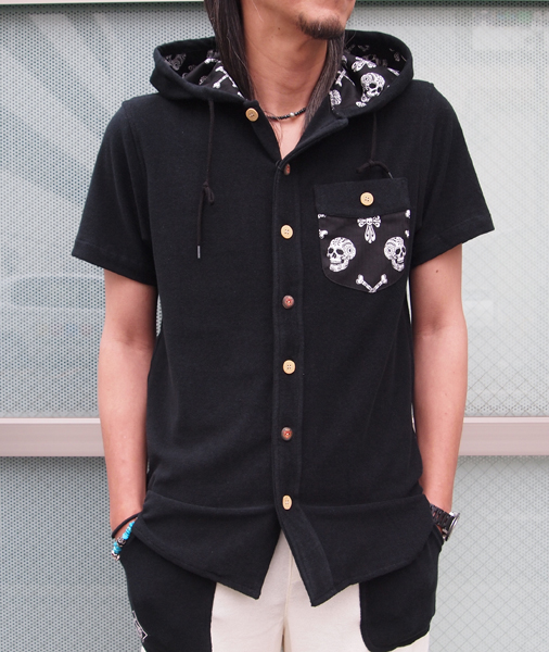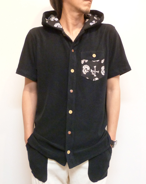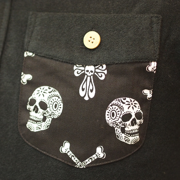 胸ポケットにも同じスカル柄生地を合わせ、全体のアクセントになっています。