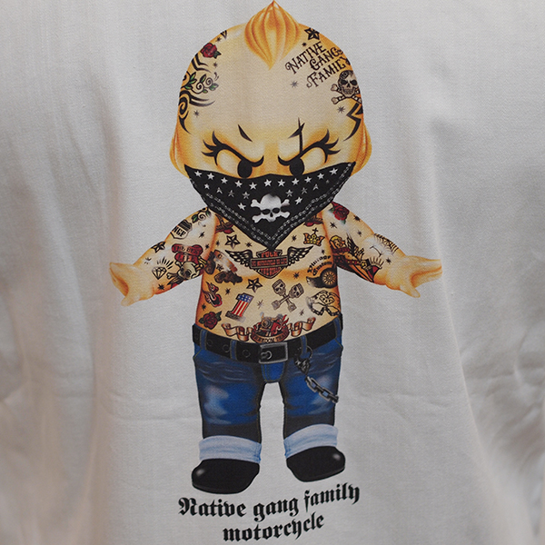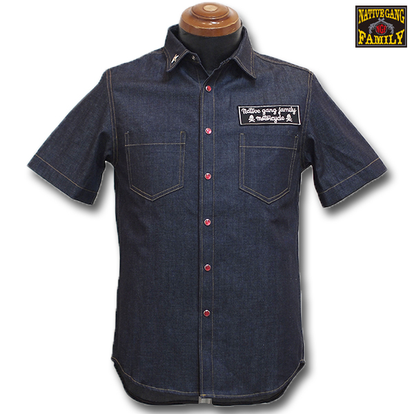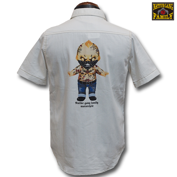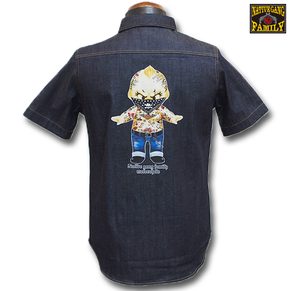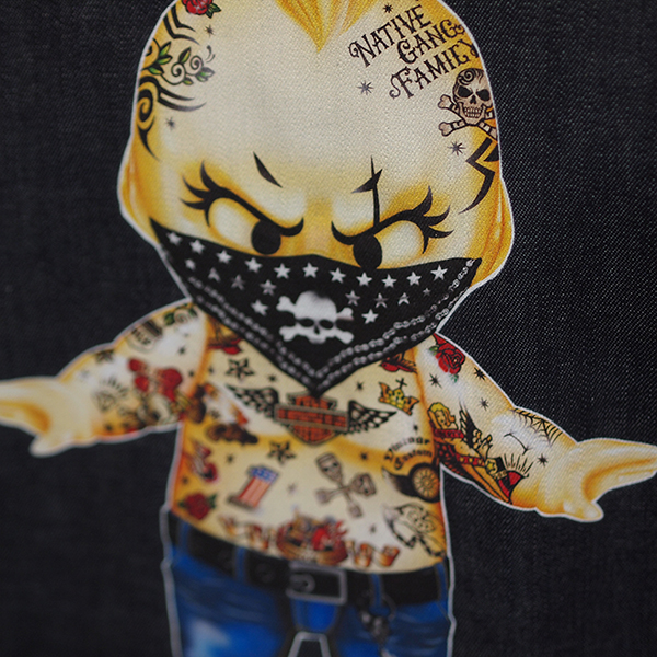 バックにTATOOベイビーをインクジェットプリントしたデニムシャツ。