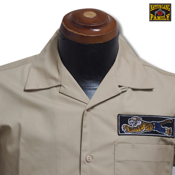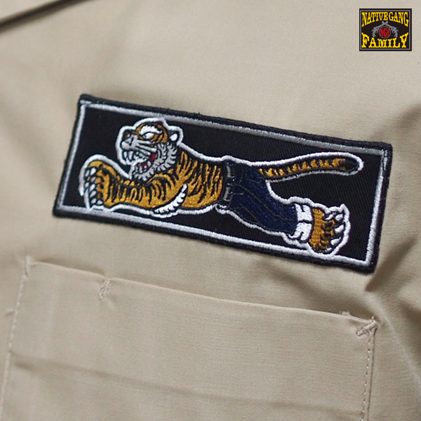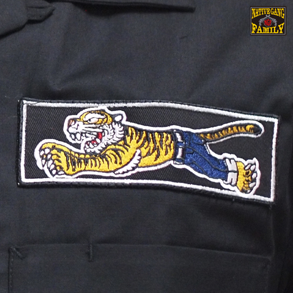 フロント胸にはデニムをはいたタイガーの刺繍ワッペンを施しました。