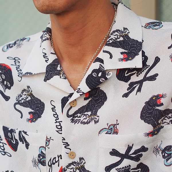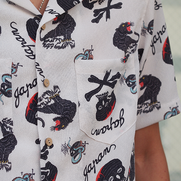 ヴィンテージスカル柄は刺繍のようなスカルやタイガーをランダムに配置したデザイン。
