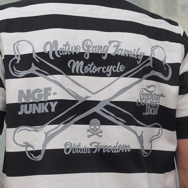太めのボーダーが印象的でバイカーには特におすすめのデザインです。 バックプリントが「ロゴ」と「ボーン」の2種類。