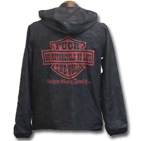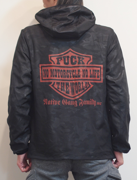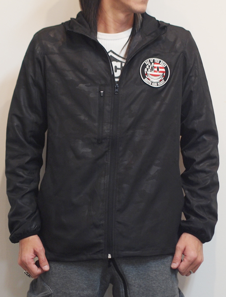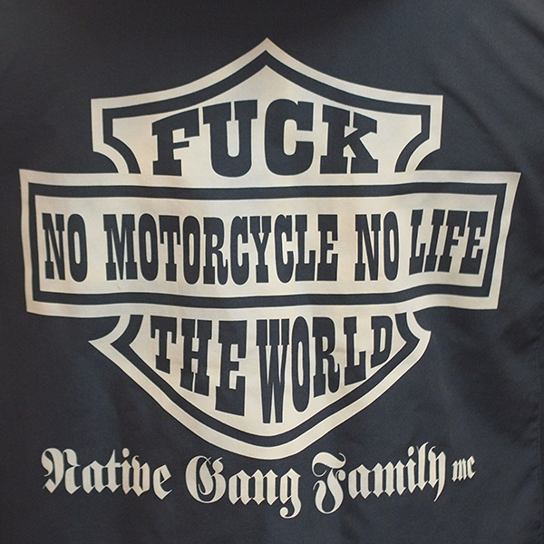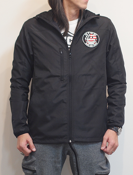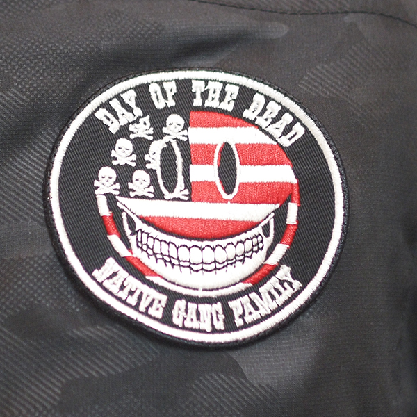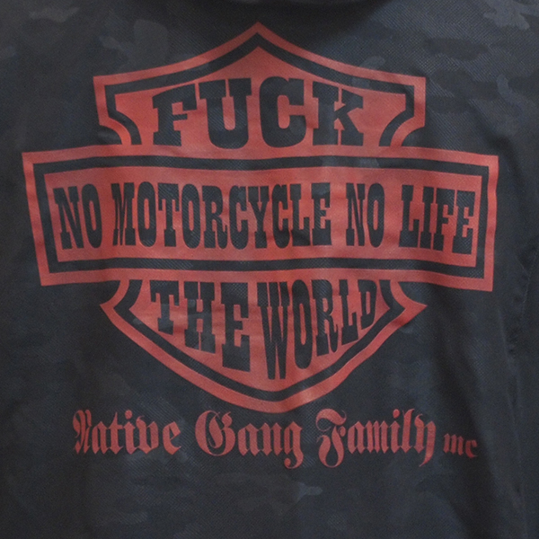 フロント左胸にはスマイル刺繍ワッペンを施し、バックにはハーレーのデザインをモチーフにしたデザインプリント。