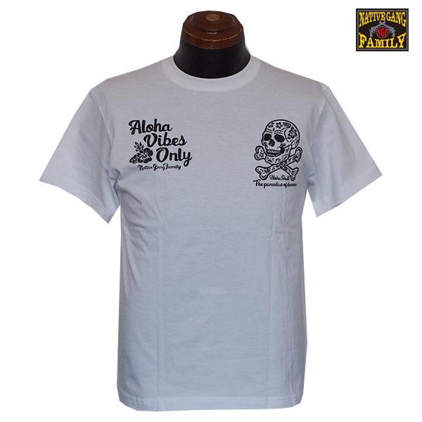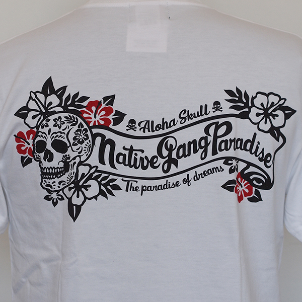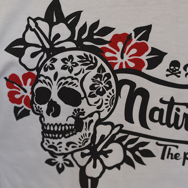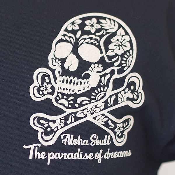 アロハ柄のスカルと、ハイビスカスを合わせたデザインのTシャツ。