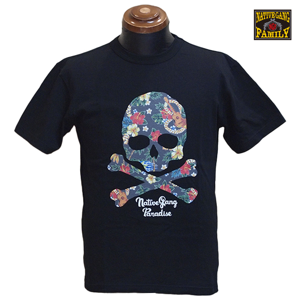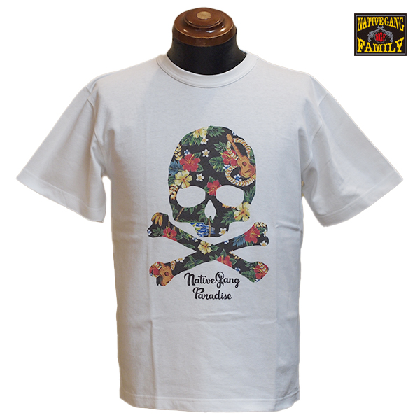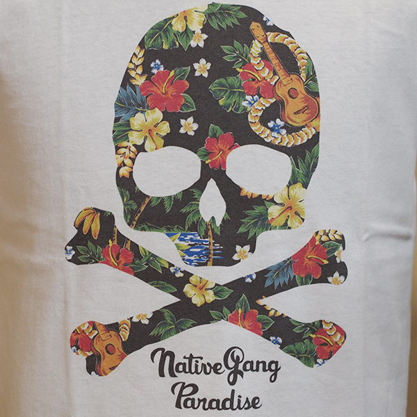 鮮やかなインクジェットプリントで、アロハスカルをデザインしたTシャツ。 夏らしい雰囲気に仕上がりました。