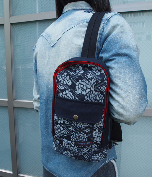 全体にインディゴのカラーに、赤のファスナーテープがアクセントになっています。