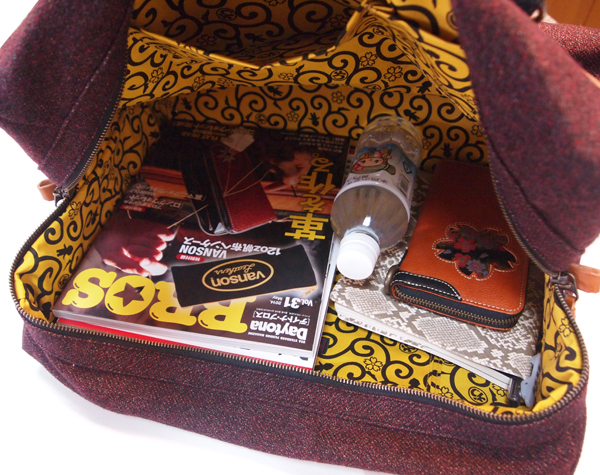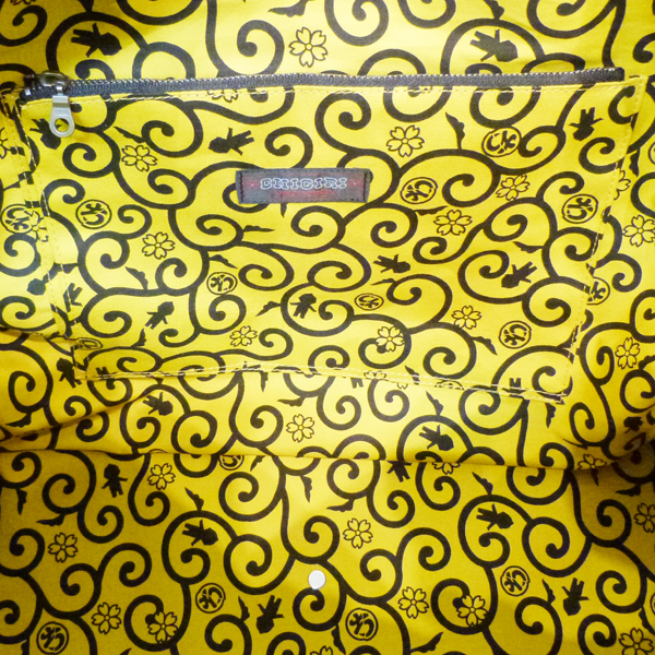 内張りにはCHIGIRIオリジナル生地を使用。唐草模様をベースに、トレードマークの桜や人気のキャラクターちぎりベイビー、○ち模様をランダムに加え、鞄を広げた時にも華やかなからし色がポイントです。