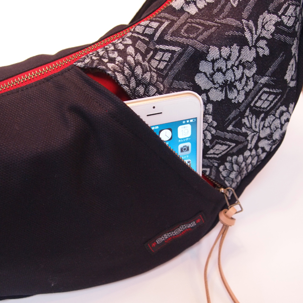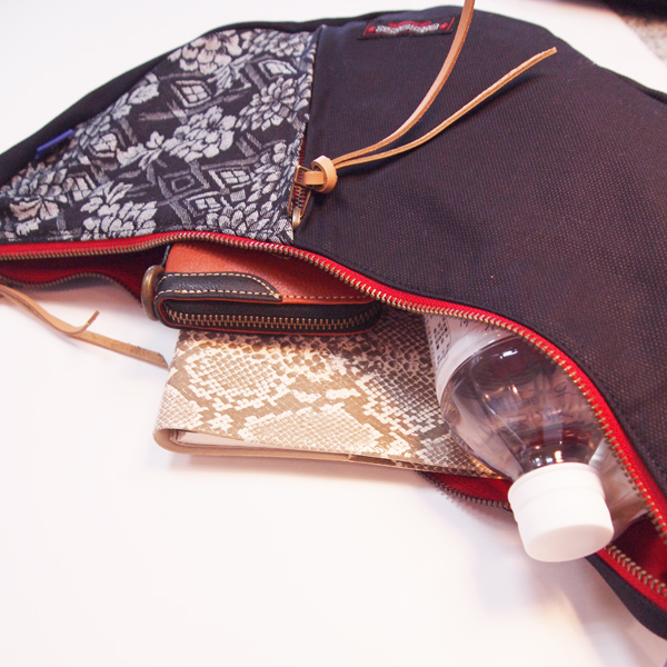 ポケットは3つ。フロントには斜めにファスナーが付いていて、すぐに出し入れしたいものを入れるのに便利です。