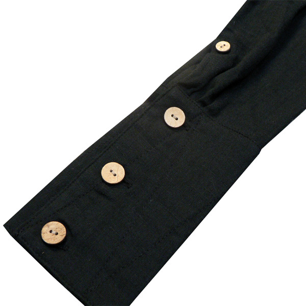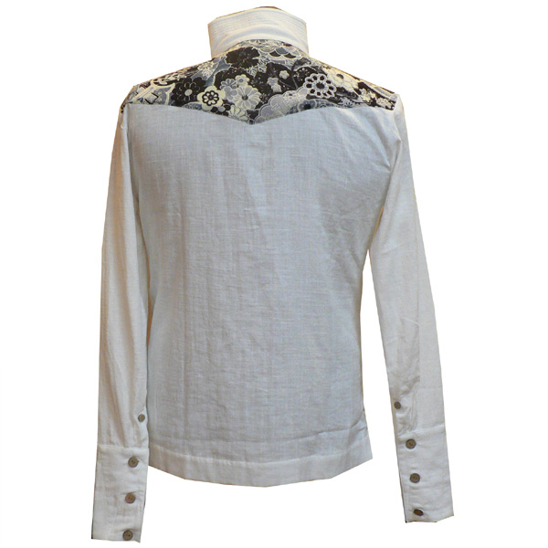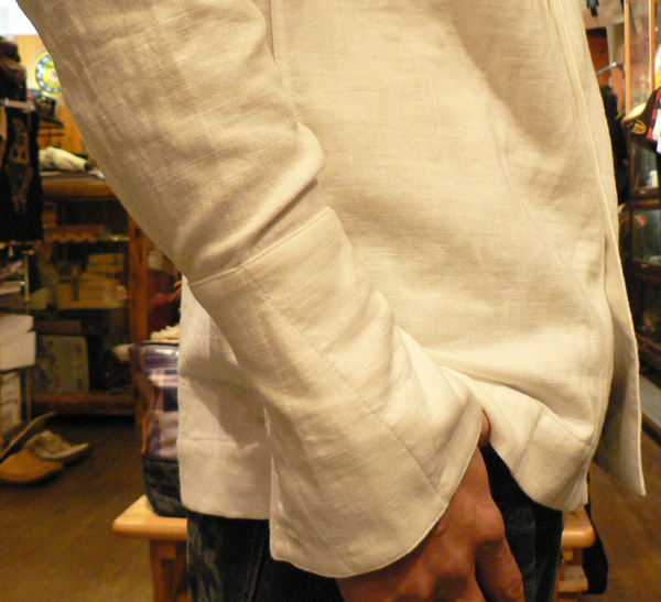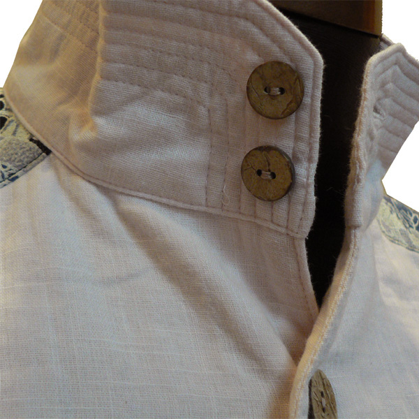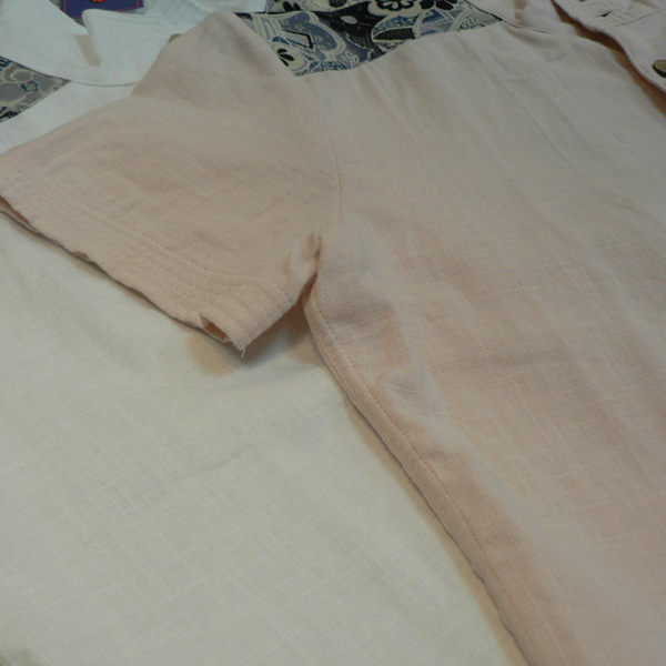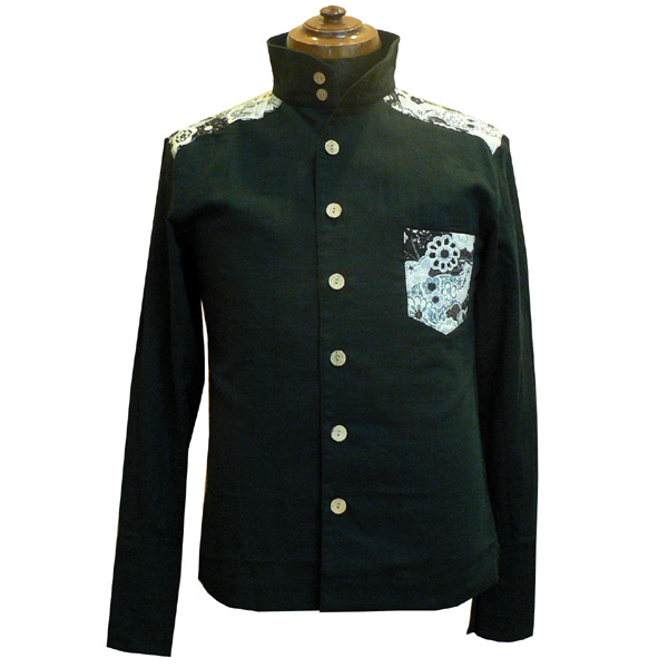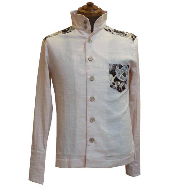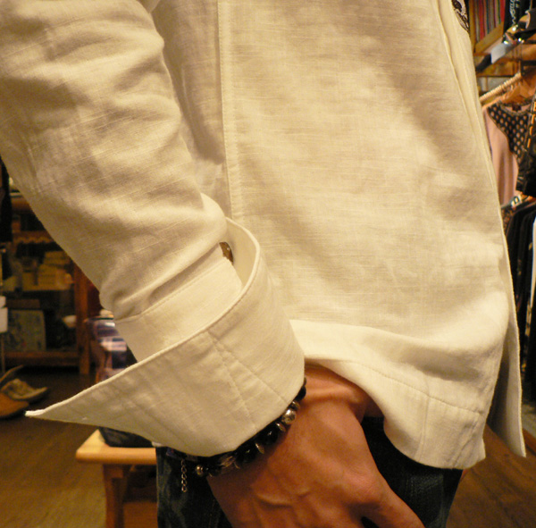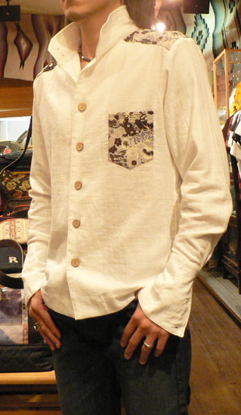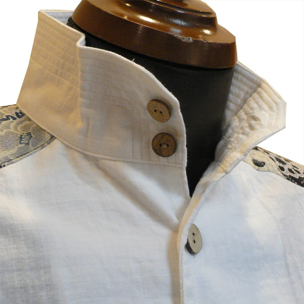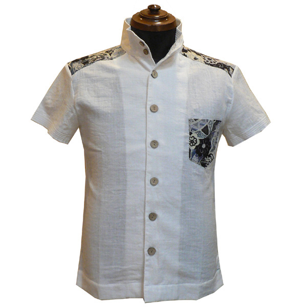 スラブガーゼ素材が涼しげなシャツ。立ち襟がカッコイイデザイン。襟、裾には5本ステッチを入れ、シャキッとしたイメージも。