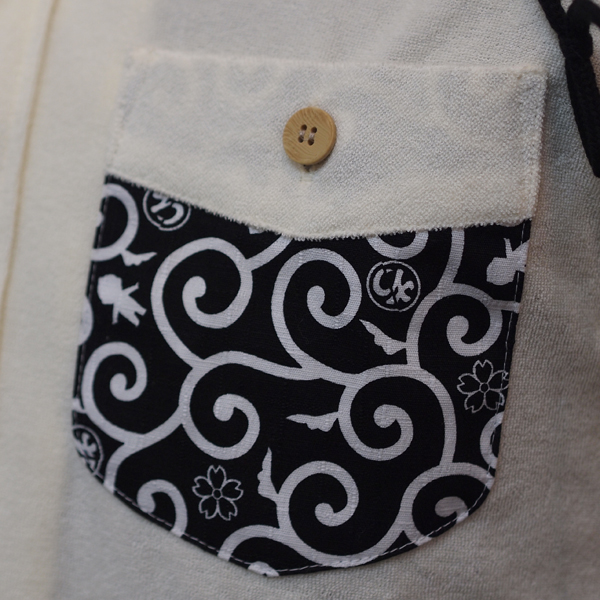 胸ポケットにも同じ唐草生地を合わせ、全体のアクセントになっています。